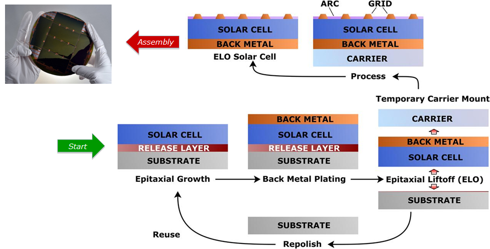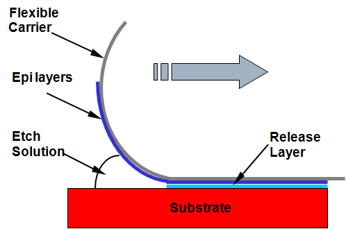 ELO is a process technology based on highly selective wet chemical etching to “peel” III-V epi-layers from their original growth substrate, and transfer the thin layers to a new carrier.